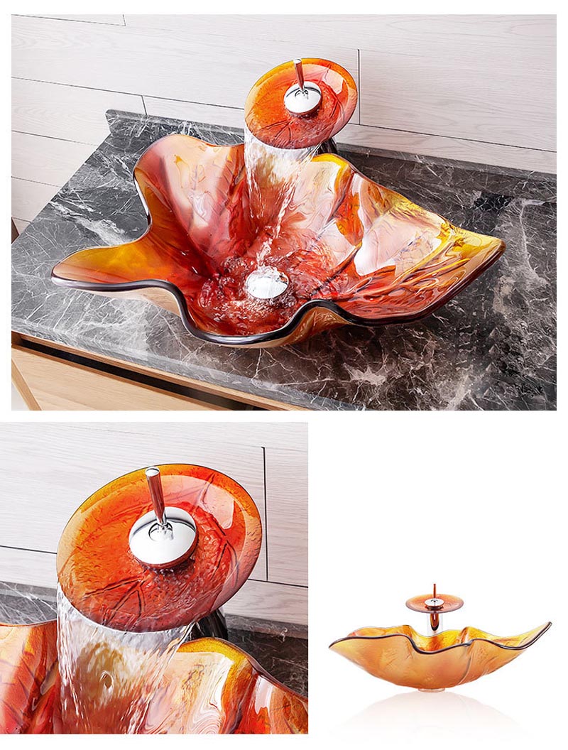 洗面ボウル 蛇口セット 洗面器 手洗い鉢 排水金具付 強化ガラス 紅葉型